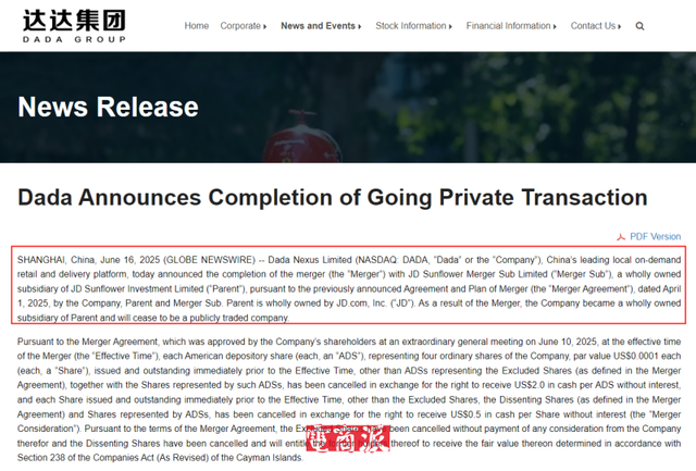 2025年4月,京東啓動對達達集團的私有化,以每股ADS 2.0美元(約為上市發行價的12.5%)進行收購,直至6月私有化完成,京東完成了對達達從參股到全資掌控的蜕變;