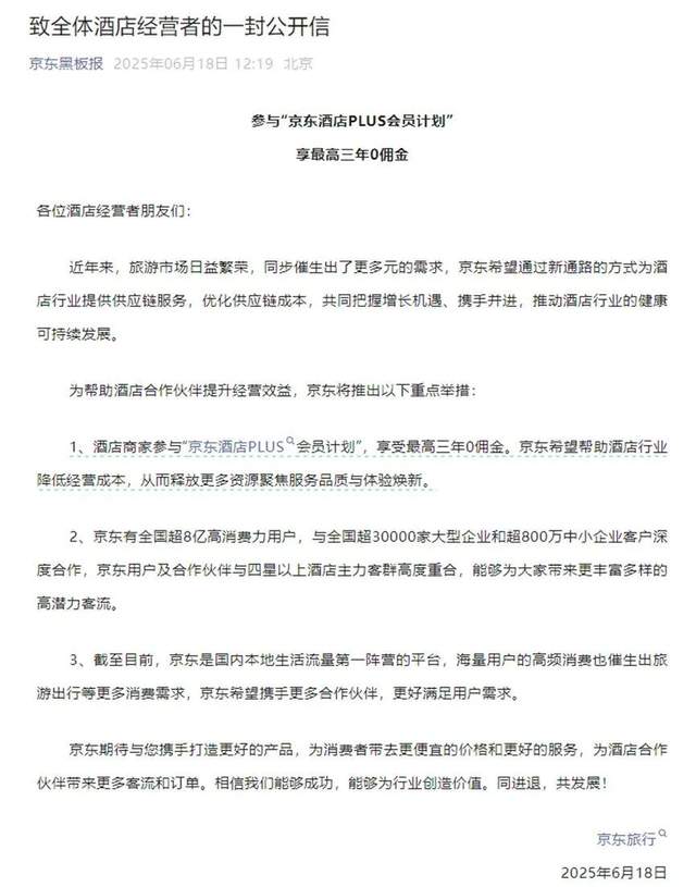 6月18日,京東官方公佈了《致全體酒店經營者的一封公開信》,表示近年來旅遊市場的繁榮催生出了多元化的需求,因此京東希望能夠為酒店經營者提供供應鏈服務,推動行業共同發展。