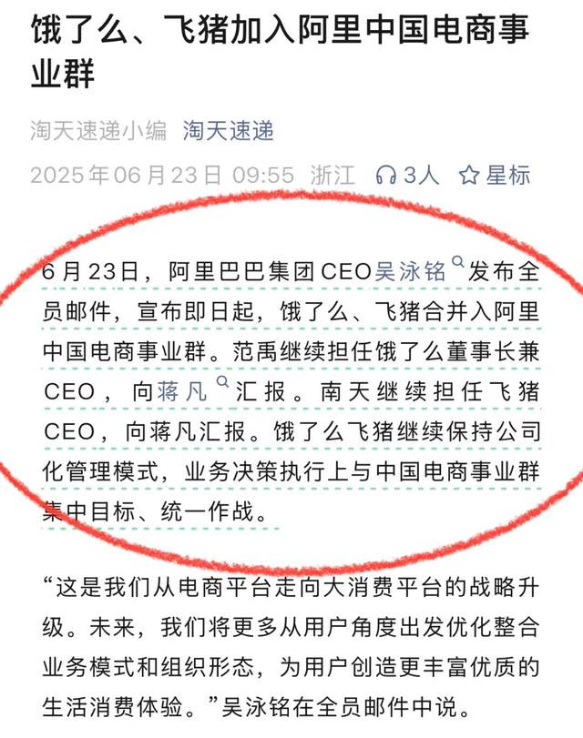 6月23日,阿里巴巴集團CEO吳泳銘發佈全員郵件,正式宣佈自即日起,餓了麼和飛豬將納入阿里中國電商事業羣的版圖。