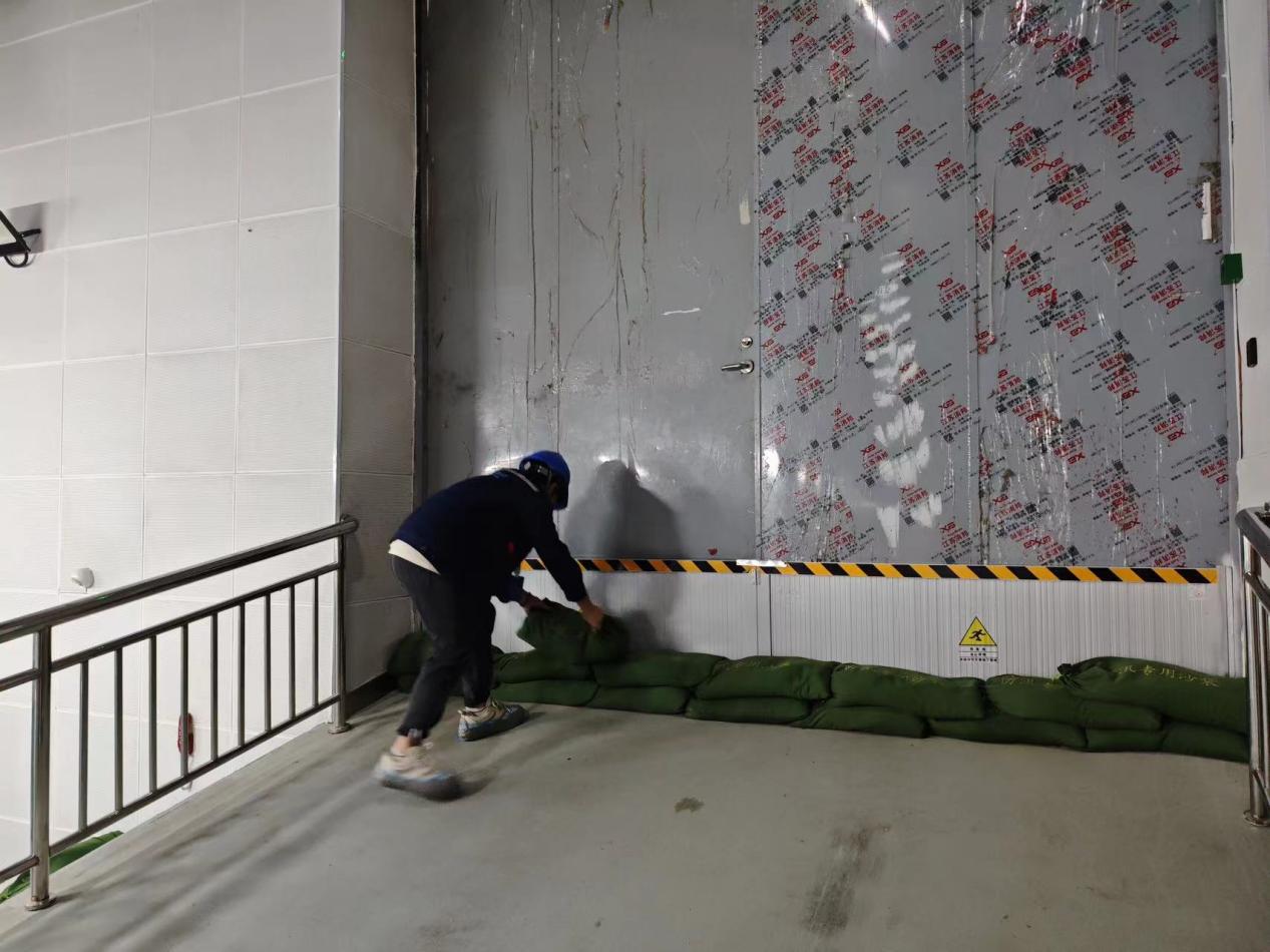 (在上海移動臨港園區,網絡維護中心工作人員嚴格檢查冷源機房、屋頂等重點區域的沙袋佈防情況。)