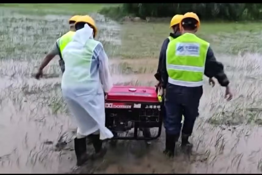 (浦東川祝某OLT機房斷電告警,搶修人員齊心協力手抬10千瓦小型發電機穿過灌溉河溝和稻田抵達基站進行供電。)
