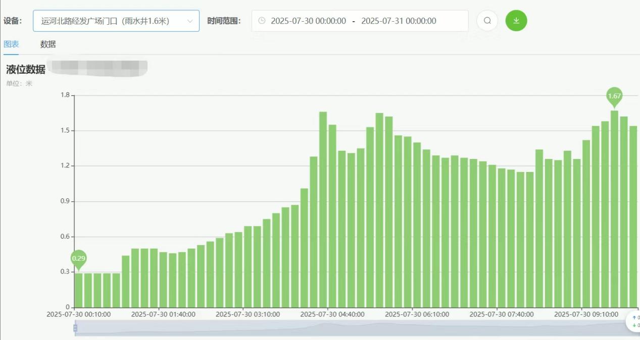 “數字員工”加入防汛工作,守護市民安全出行。上海移動奉賢分公司在數字家園項目的基礎上,於運河北路經發廣場門口、韓村路、南橋老街內部道路等易積水的雨水井、雨水篦子安裝基於NB-IoT的預警液位儀和流量測速裝置,並設置1.5米井深水位和流速驟停等異常情況的預警。“竹節草”雨勢洶洶,7月30日4時和7時,雨水井液位2次急劇上升至1.66米(尚餘34cm井深空間),系統自動出發預警短信,運維人員第一時間趕至現場,對井內水位採取抽水預降措施,同步清理周邊流速異常的雨水篦子和截污掛籃,有效避免積水。