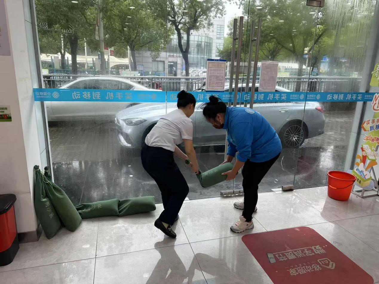 (上海移動唐鎮營業廳工作人員認真做好廳內防汛措施。)