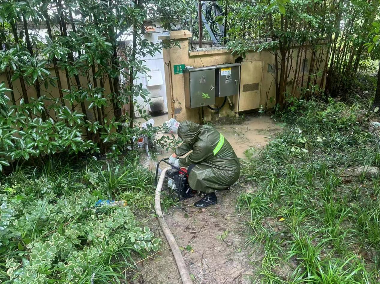 (風雨影響期間,上海移動搶修隊員們冒雨奔襲遭遇積水的低窪現場,架起抽水泵,用沙袋築起擋水牆,同步加固機房擋水板,有效阻止水勢蔓延。)