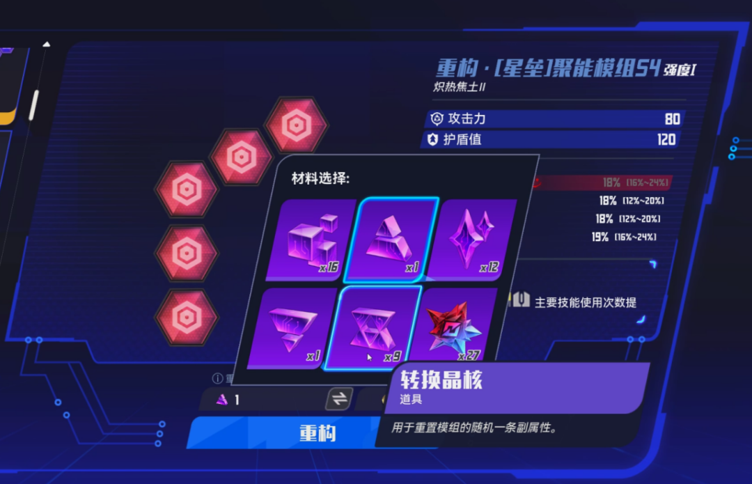 真到了卡關的時候,還是免不了要刷幾次簡單圖,去刷模組和強化材料“晶核”。調整模組的數值加成、優化模組詞條、附加核芯孔位,乃至改變模組的形狀,以便將心儀的模組插進拼圖一般的矩陣裏,都需要海量的晶核。