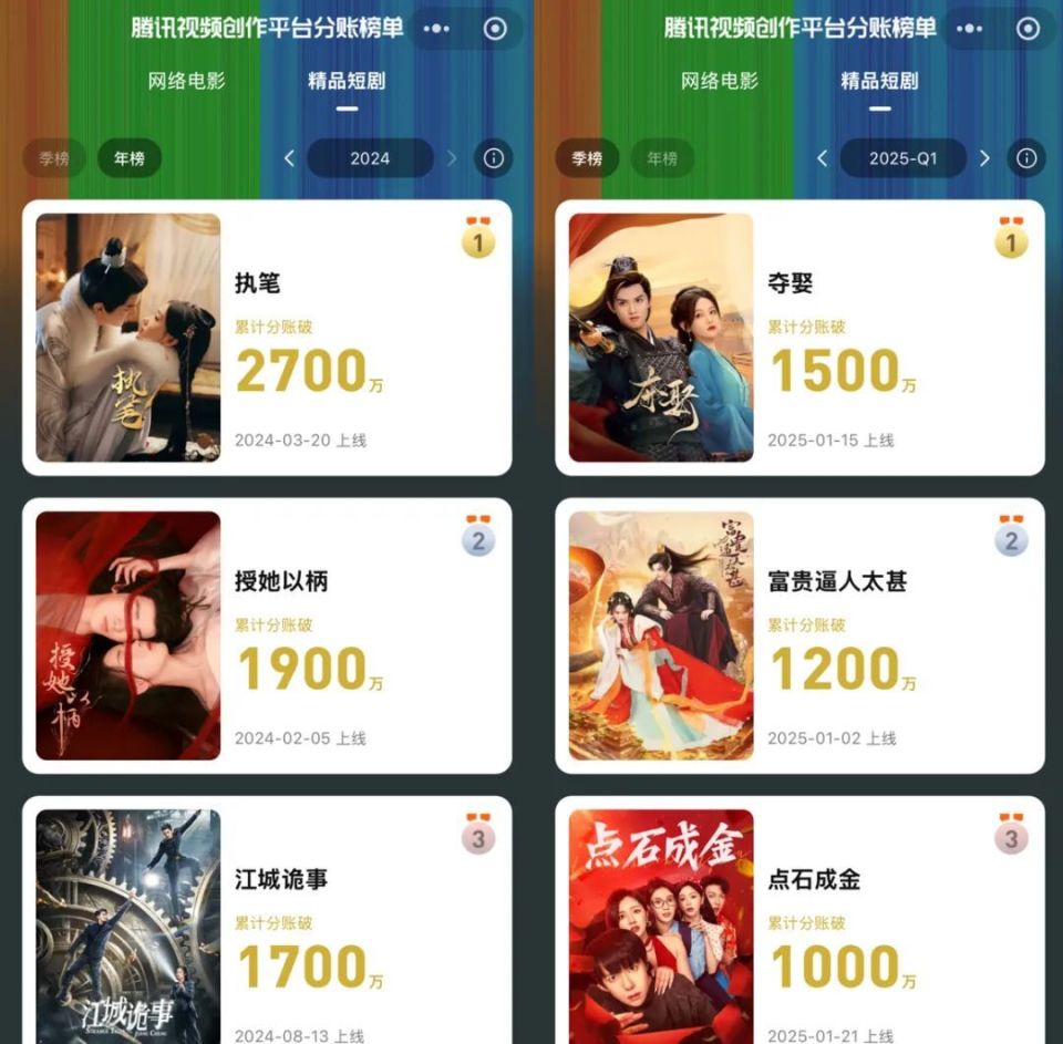 從分賬表現來看,今年橫短似乎也沒了前兩年的風光。雲合數據《2025H1上新精品短劇累計分賬票房破百萬榜單》顯示,上半年最高的《奪娶》分賬1500萬,與去年2700萬的《執筆》、破3000萬的《原罪》相距甚遠,整體來看,只有少數作品能邁過千萬大關,更多短劇在500萬以下分賬徘徊。