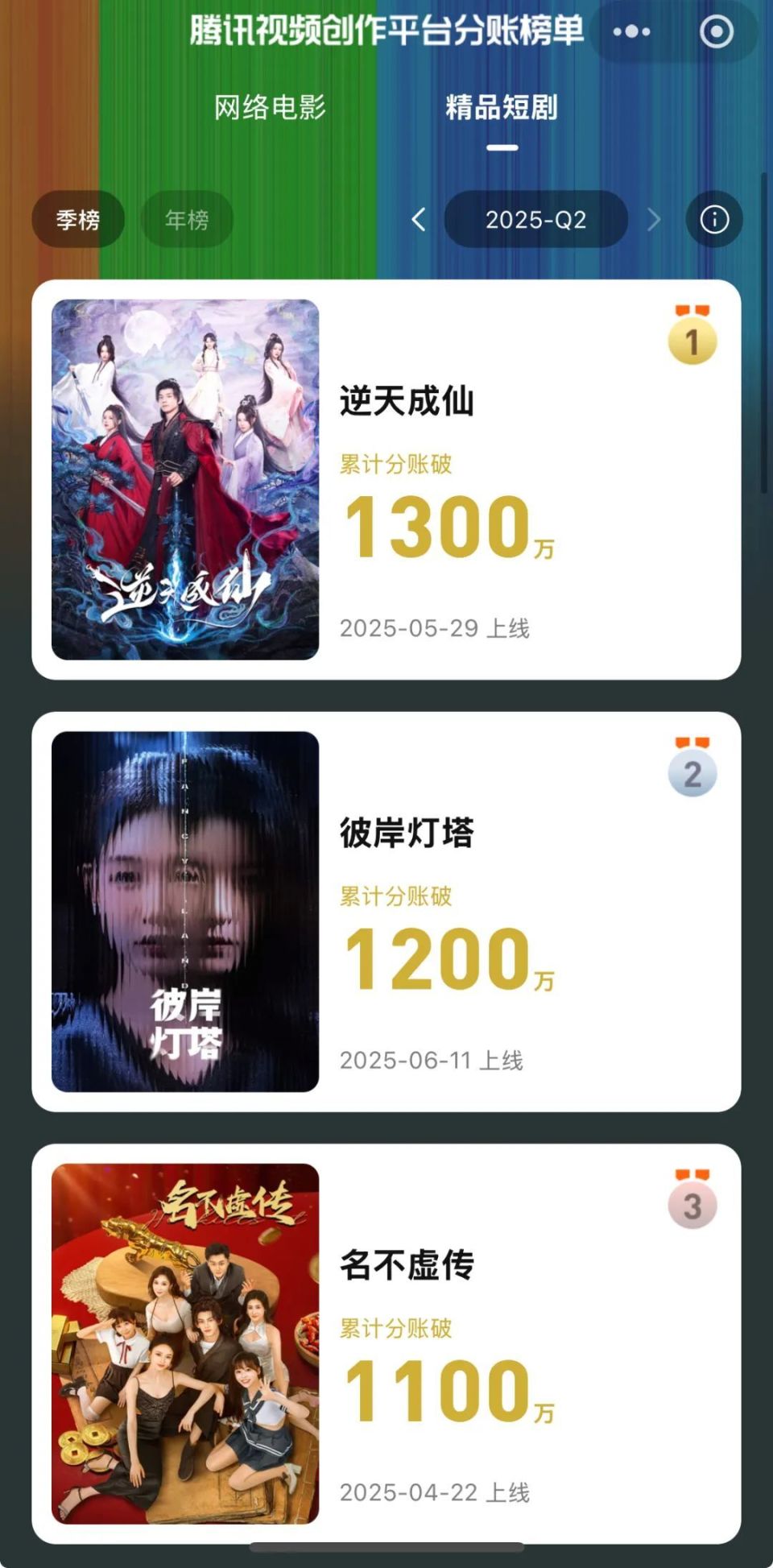 騰訊視頻創作平台分賬榜單顯示,二季度精品分賬排行前13名中,男頻題材佔據了9個席位,其中《逆天成仙》目前分賬1300萬、《名不虛傳》1100萬、《我能預見成功率》800萬等,都收穫了不錯的票房關注度。