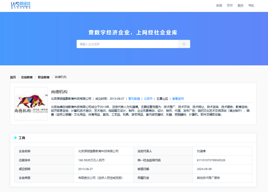 據網經社企業庫顯示,“尚德機構”屬於北京原馳蠟象教育科技有限公司,成立於2013年,法定代表人為劉通博。
