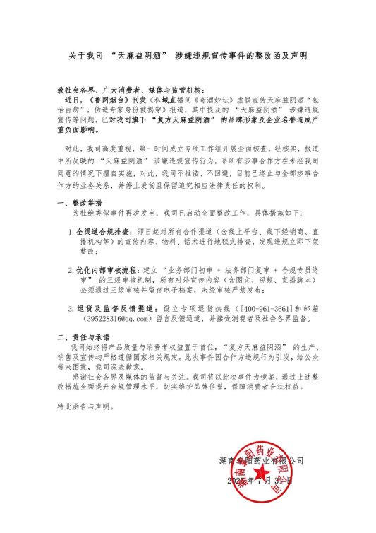 7月31日,湖南泰陽藥業有限公司給魯網•民生幫辦發來一份《關於我司“天麻益陰酒”涉嫌違規宣傳事件的整改函及聲明》,在這份致社會各界、廣大消費者、媒體與監督機構的公開函中,泰陽藥業公司首先指出,魯網日前關於“天麻益陰酒”涉嫌違規宣傳等問題的報道,已對其公司旗下“複方天麻益陰酒”的品牌形象及企業名譽造成嚴重負面影響。