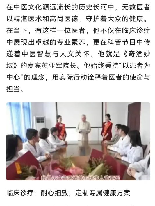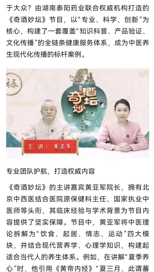 記者從網絡搜索相關新聞信息獲悉,一篇題為《奇酒妙壇:以專業築信任,用創新傳文化》的文章,將《奇酒妙壇》節目描述成“以專業、科學、創新為核心,構建了一套覆蓋知識科普、產品驗證、文化傳播的全鏈條健康服務體系,成為中醫養生現代化傳播的標杆案例。”並配圖主講人“黃亞軍”節目中的圖像。黃亞軍的頭銜被定義為“擁有北京中西醫結合醫院原保健中心主任、國家執業中醫師”,宣傳“黃亞軍將中醫理論拆解為四大模塊,並結合現代營養學、心理學知識,構建起當代人的養生體系。”