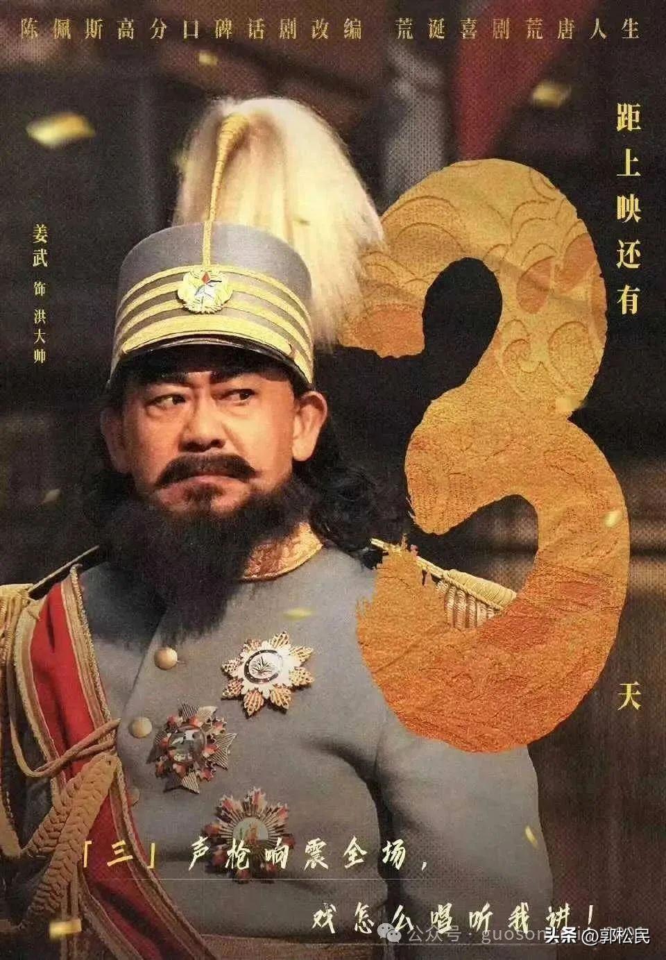 比如,洪(紅)大帥的命名,洪大帥紅底黑色的版畫風格肖像,反覆強調的“開國大戲”,徐處長朗誦的那首詩,以及洪大帥看戲時的投入,觸景生情並且落淚……