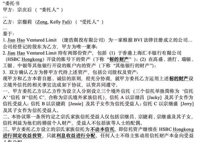第二,宗慶後確實與宗馥莉曾簽訂一份委託協議設立三個境外信託,每個信託額度7億美元,合計21億美元。該信託為不動本信託,受益人只就利息收益進行分配,任何人士不得主張動用信託財產本金。受益人僅包括宗繼昌、宗婕莉、宗繼盛及其子女,不包括配偶等。
