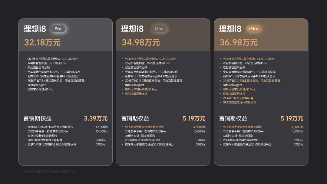 當然,“小MEGA”並不是MEGA,理想i8的定位與MEGA有明顯區分,它沒有繼續做高端MPV,而是定位家庭6座純電中大型SUV,共推出了Pro、Max、Ultra三個版本,售價與自家的理想L8基本持平,分別為32.18萬元、34.98萬元和36.98萬元。