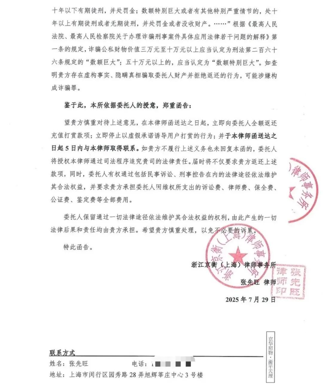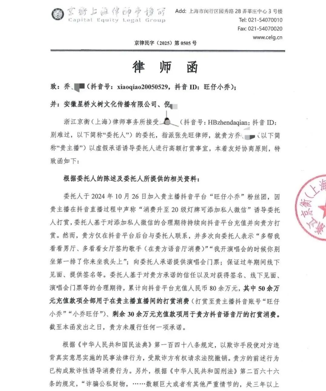 律師函稱“旺仔小喬”涉嫌構成詐騙罪,要求全額返還充值打賞款項,並停止以虛假承諾誘導用户打賞的行為。
