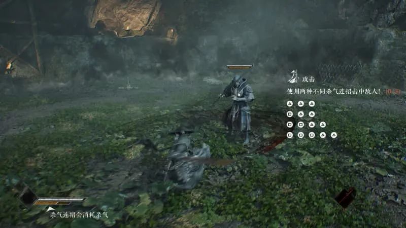 但正如開頭提到,當你拿起手柄進入戰鬥,似乎一切“外貌”都不重要了……新手教程詳解了動作系統,基礎攻擊分為 □ 普攻和 △ 殺氣,兩者交替組合按下即可打出連招。哪怕完全沒玩過動作遊戲,哪怕不知道殺氣攻擊有啥用,小白玩家一通亂按也能打出行雲流水的武俠招式,真·零門檻!