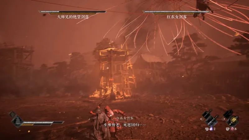 戰鬥勝利後,大師兄會被絲線操控復活,進入更難纏的二階段“大師兄的絕望劍意”。該階段大師兄基本都在天上被絲線吊着,攻擊方式主要以盪來盪去的劈砍突刺為主,持續按着格擋找機會反擊就行,而且紅光/白光攻擊都屬於比較好應對的輸出窗口。