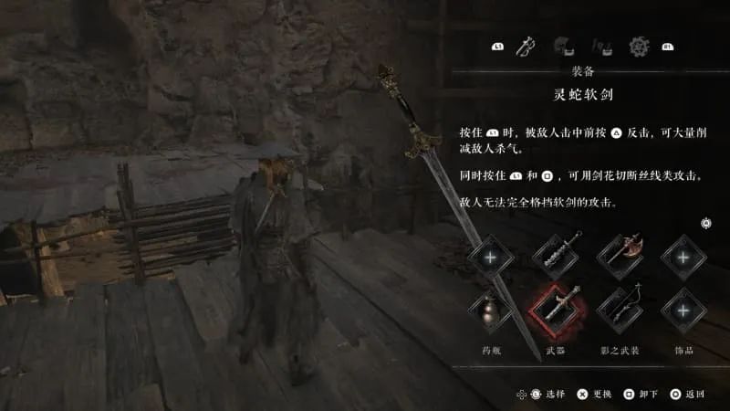 它普通攻擊範圍較大,而且出手速度很快,適合用來應對被兩三個怪圍攻的情況。更重要的是,按住 L1 被敵人擊中前再按下 △ 還能直接反擊,大幅消減敵人殺氣。同時按 L1+□ 還會甩出劍花,帥到不可方物不説,對關底 BOSS 還有奇效,這點咱們稍後也會聊到。
