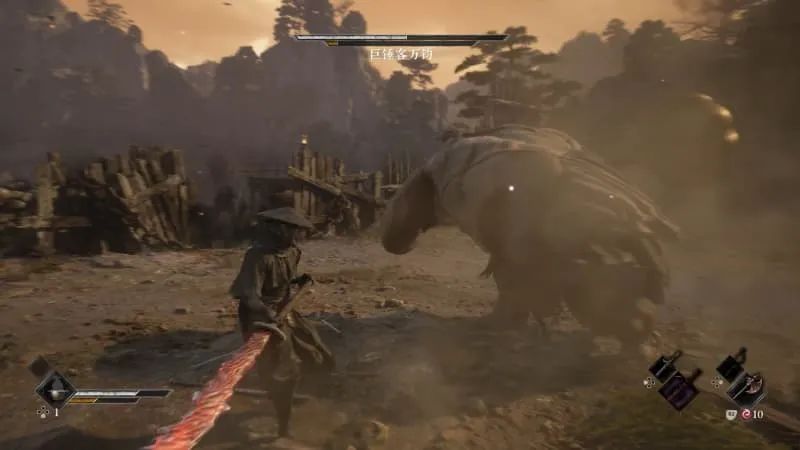 除此之外,試玩版的道中 Boss 戰也是誠意十足,名為“巨錘客萬鈞”的肥仔主打一個剛猛。招數有直來直去的“龍車”突擊、巨錘三連下砸(快慢刀)、拿錘子 360° 大回環轉圈、與身形不符的三連飛踢,以及不講武德的揚沙遮視野……