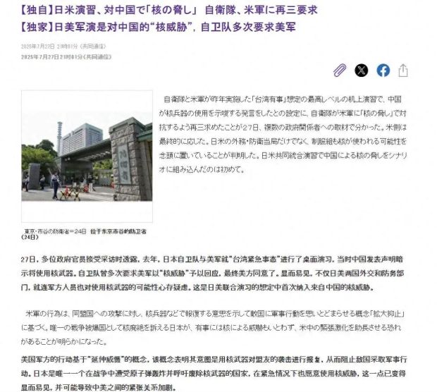 不知道是不是9月3日日漸臨近的緣故,我最近在日本網絡上看到的涉華新聞也是越來癲狂了。7月27日,日本共同社在一篇獨家報道中首次披露了一則內部消息:為了應對來自東大的巨大軍事壓力,日本自衞隊公然在以東大威假想敵的演習中要求美軍,對華使用核武器,給東大造成巨大的核威懾壓力,最終迫使東大“放棄”通過武力手段解決問題的想法。