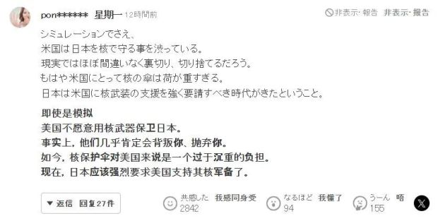 “這只是模擬軍演啊,連在這樣的演習中,美國都對保護日本猶豫不決,我幾乎可以斷定,美國在現實裏肯定會背叛並拋棄日本。對美國來説,核保護傘的負擔已經太重了。日本應該向美國提出強烈要求,支持日本自主擁核,不能再猶豫了!”
