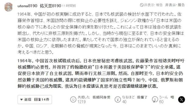 “在1964年東大首次成功進行核試驗後,日本曾暗中考慮過發展核武器。佐藤榮作在訪美時強調了核威懾的必要性,但在約翰遜政府那裏得到了‘日本有美國的核保護傘罩着’的安全承諾之後,輕易就放棄了自主擁核計劃,轉而提出了所謂的‘非核三原則’。從那時到今天,日本的安全保障一直依賴美國的核威懾力。這樣的日本也能叫獨立國家嗎?面對東大、俄羅斯和朝鮮的核威脅,這樣的日子到底還能不能繼續過下去?我覺得這是一個值得我們所有日本人認真思考的問題。”