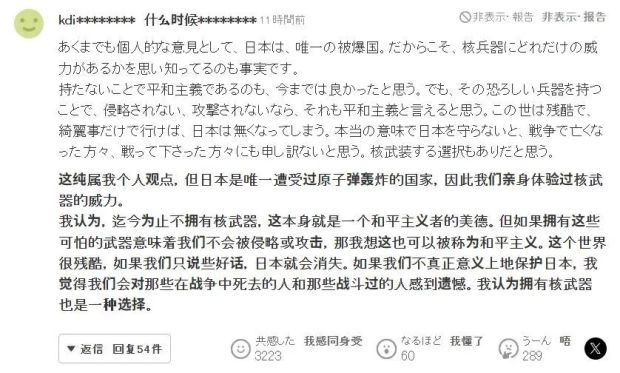但恰恰因此,當共同社這篇報道被轉載到日本雅虎上之後,那兒的很多日本網民坐不住了。評論區裏洋洋灑灑1400多條評論,我愣是沒看見一條附和共同社的留言。幾乎所有日語評論都在為自衞隊要求美軍對華進行“核威懾”一事歡呼叫好,甚至還有人嫌這都不夠,覺得此等關乎日本生死存亡的大事,不能把最後的希望寄託在美國人身上,而是應該努力發展自身的核實力,爭取早日實現“日本擁核”的前景。