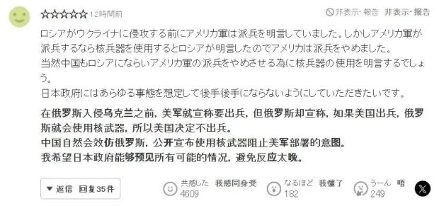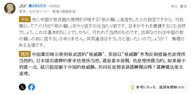 “這篇報道的前提是,東大首先拋出了‘核威脅’,並暗示可能會動用核武器。在這種情況下,美國採取對策,以‘核威脅’回擊是理所當然的,日本要求美國這樣做也是順理成章。這是最基本的邏輯,應該這麼做。如果不這樣做,日本和美國就只能屈服於東大的核威脅。共同社難道是想讓日本向東大投降嗎??這種豈有此理的主張怎麼可以被允許呢? ”
