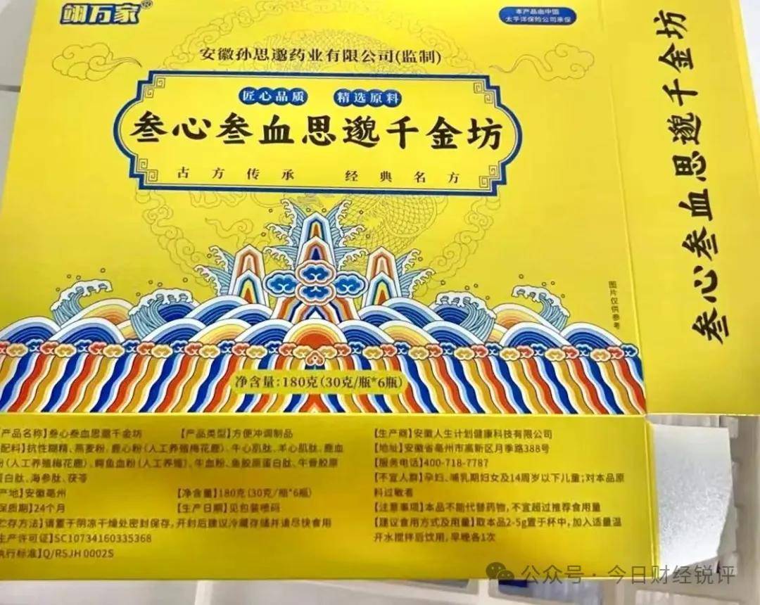 而媒體通過消費者提供的產品圖片瞭解到,王振磊強力推銷的“十二味思邈千金方”“叁心叁血思邈千金方”兩款產品,均為安徽孫思邈藥業有限公司委託安徽人生計劃健康科技有限公司生產的方便衝調製品,產品名稱分別為十二味思邈千金坊、叁心叁血思邈千金坊,僅為普通食品。