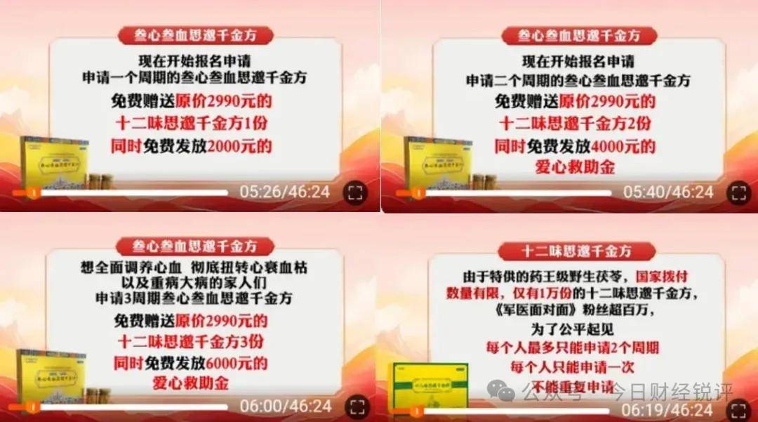 欄目最後開始播放廣告,“申請一個週期的叁心叁血千金方免費贈送原價2990元的十二味思邈千金方1份,同時免費發放2000元的愛心救助金;申請二個週期的叁心叁血千金方免費贈送原價2990元的十二味思邈千金方2份,同時免費發放4000元的愛心救助金;想全面調養心血徹底扭轉心衰血枯以及重病大病的家人們申請3個週期參心參血思邈千金方,免費贈送原價2990元的十二味思邈千金方3份,同時免費發放6000元的愛心救助金。”