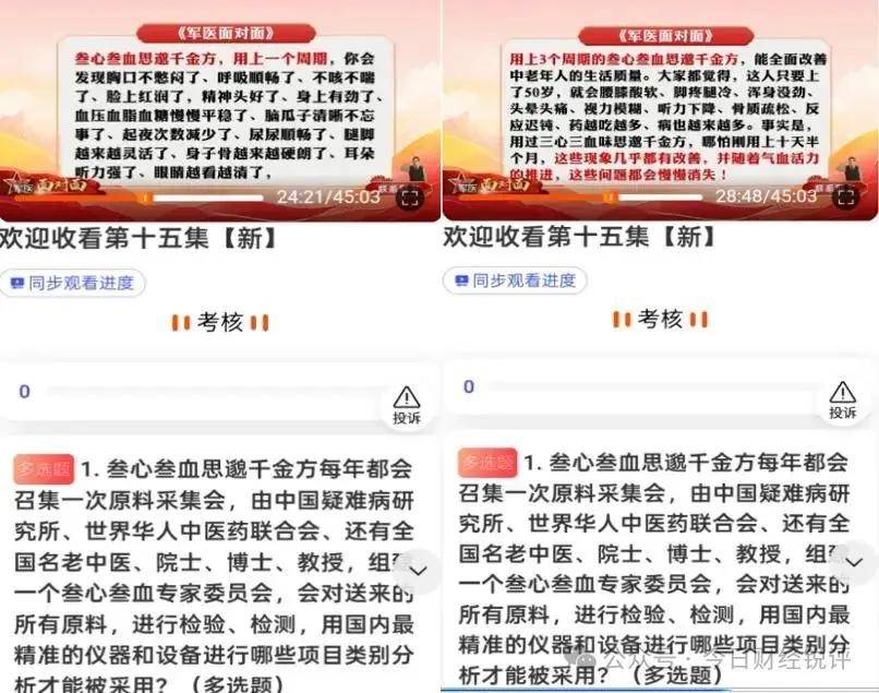 6月25日、7月2日,媒體按照投訴人的指引,成功添加上名為“佳信[005]”“公益課-小崔”的微信,隨後就收到了養生課直播鏈接。在其授權驗證後進入了《軍醫面對面》養生課的直播間。課程45分鐘左右,課程前一部分是先導視頻,視頻中出現人民軍醫在2003年抗擊非典疫情、2008年汶川地震救災現場及2020年新冠疫情中挺身而出的身影。