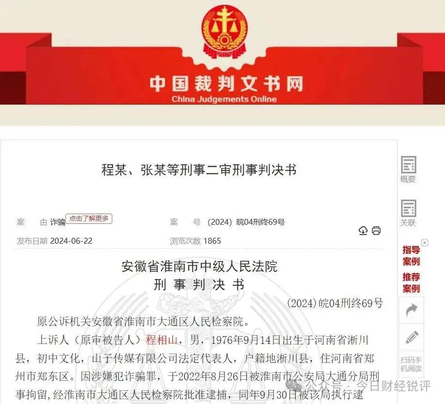 他還指出,安徽一起虛假包裝“養生專家”,閉環直播精準收割,詐騙萬名老人4750餘萬元的10年詐騙團伙早已落網,2024年5月安徽淮南中院做出(2024)皖04刑終69號二審刑事判決,對程某山、張某照等10名詐騙成員分別判處13年半、10年半等有期徒刑,並處罰金。而王振磊的“神方”騙局與該案如出一轍。