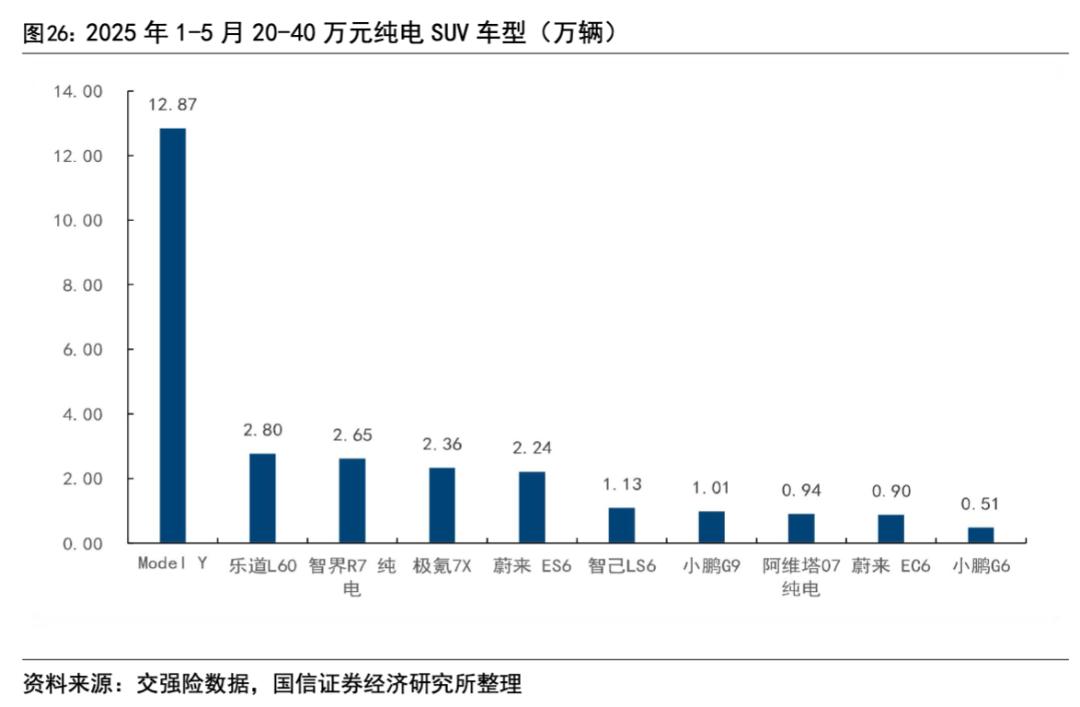 在這個市場裏,特斯拉Model Y(2024年全年銷量高達48.12萬輛)銷量領先,其他年銷量在10萬輛以上的車型還包括問界M7、理想L6、大眾探嶽、理想L7、CRV、途觀L等;在純電SUV領域有樂道L60、智界R7純電、極氪7X、蔚來ES6等。