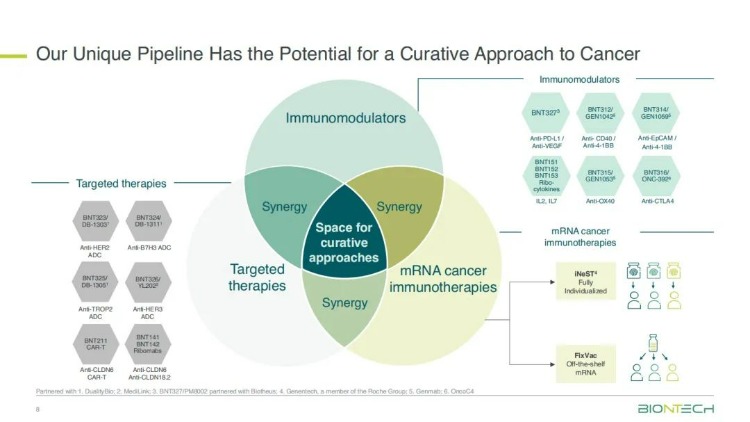 BioNTech全力押注下一代腫瘤免疫療法(IO, Immuno-Oncology),以mRNA疫苗為基本盤,在雙抗、細胞療法等領域重兵佈局,這也讓資本市場對其預期發生大幅扭轉。