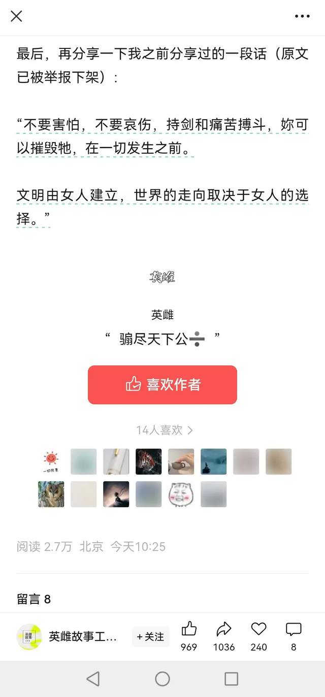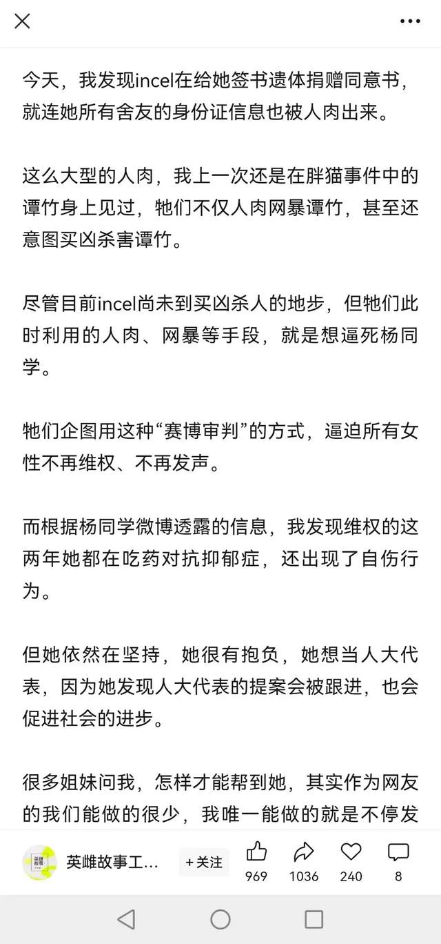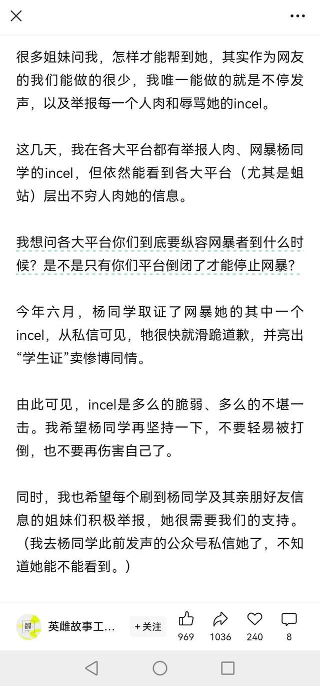 而網上類似的聲援文章還不少,賬號為“英雌故事工作室”的《所有平台都在縱容incel網暴楊同學》內容同樣逆天,如果不是武大的女生髮聲,那麼也是蹭流量不嫌事大的。