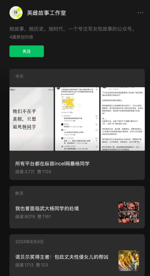 而網上類似的聲援文章還不少,賬號為“英雌故事工作室”的《所有平台都在縱容incel網暴楊同學》內容同樣逆天,如果不是武大的女生髮聲,那麼也是蹭流量不嫌事大的。