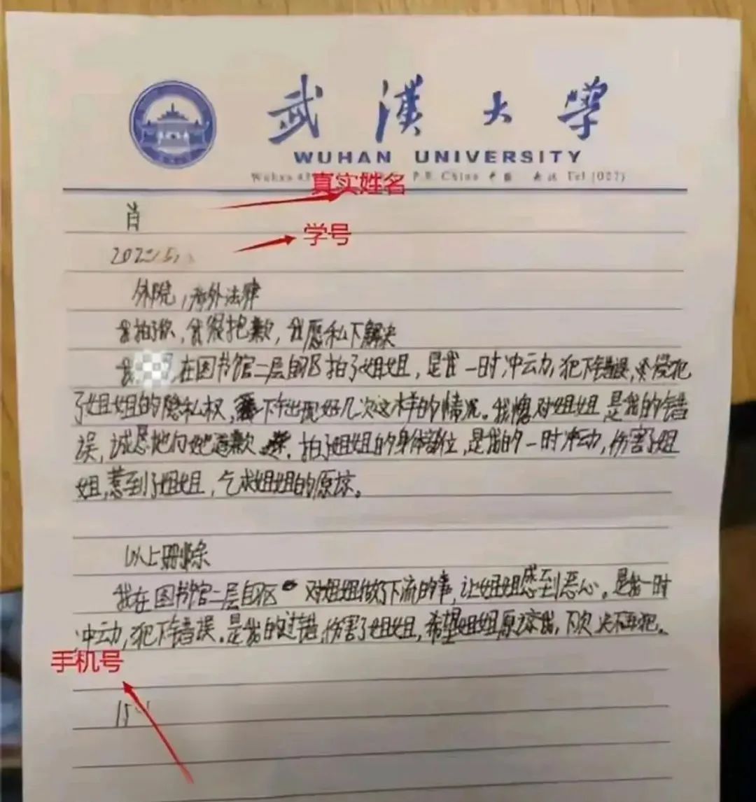 用本校的信籤紙,透露真實姓名、學號和手機號,寫完後又重寫一個版本(應該是對方要求)。