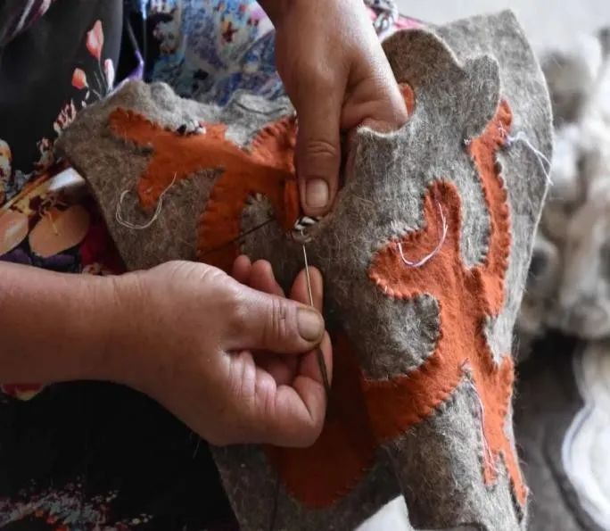 在這個過程中,上下兩層氈和嵌入的羊毛在濕熱和壓力的作用下,纖維互相糾纏、咬合,最終牢固地結合成一塊雙層一體的厚實花氈,圖案邊緣因羊毛纖維的相互滲透融合,呈現出獨特的、略微模糊的柔和過渡效果。