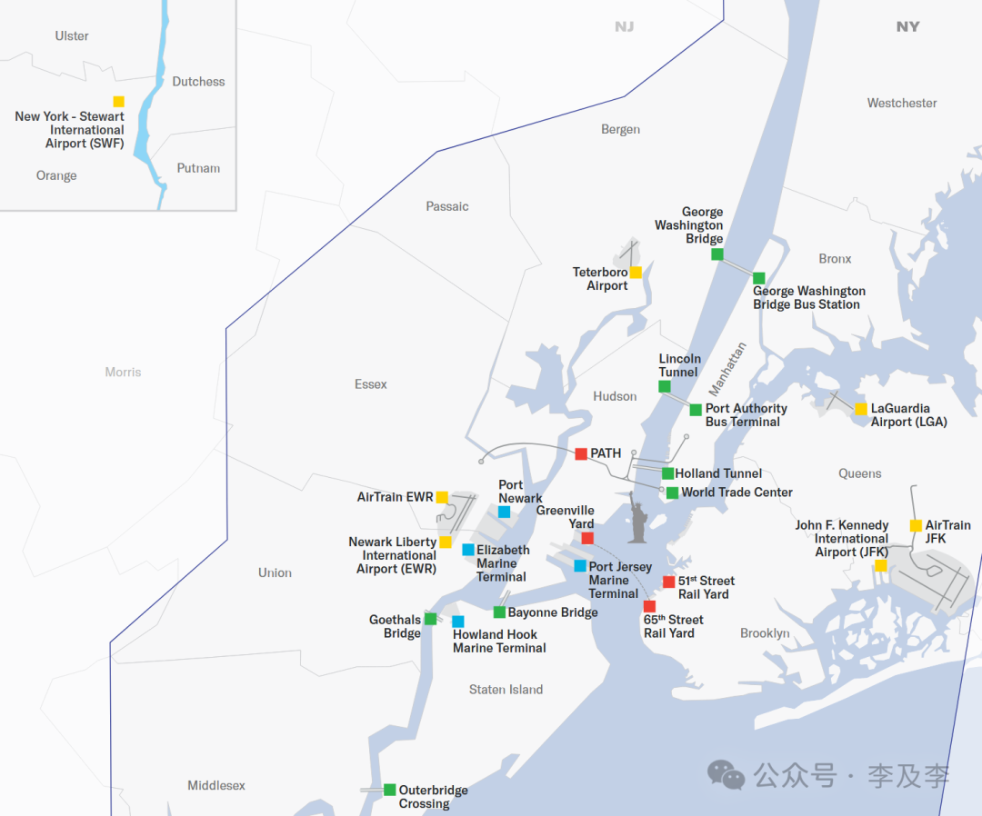 PANYNJ 是世界少有的交通運輸行業的綜合性機構。除了作為跨州機場集團管理拉瓜迪亞、紐瓦克、肯尼迪等 6 座機場以外,PANYNJ 還管理紐約和新澤西的各大海港、跨越哈德遜河的地鐵(PATH)、兩座隧道和一座大橋,甚至西半球最高的寫字樓世界貿易中心,也是他們的物業之一。如果放在香港,就是葵青碼頭、三條隧道、九鐵公司、機場管理局和國金一二期放在一家機構旗下管理;放在上海,那就是上港集團、上海機場、上海市域鐵和上海中心在一家機構傘下。