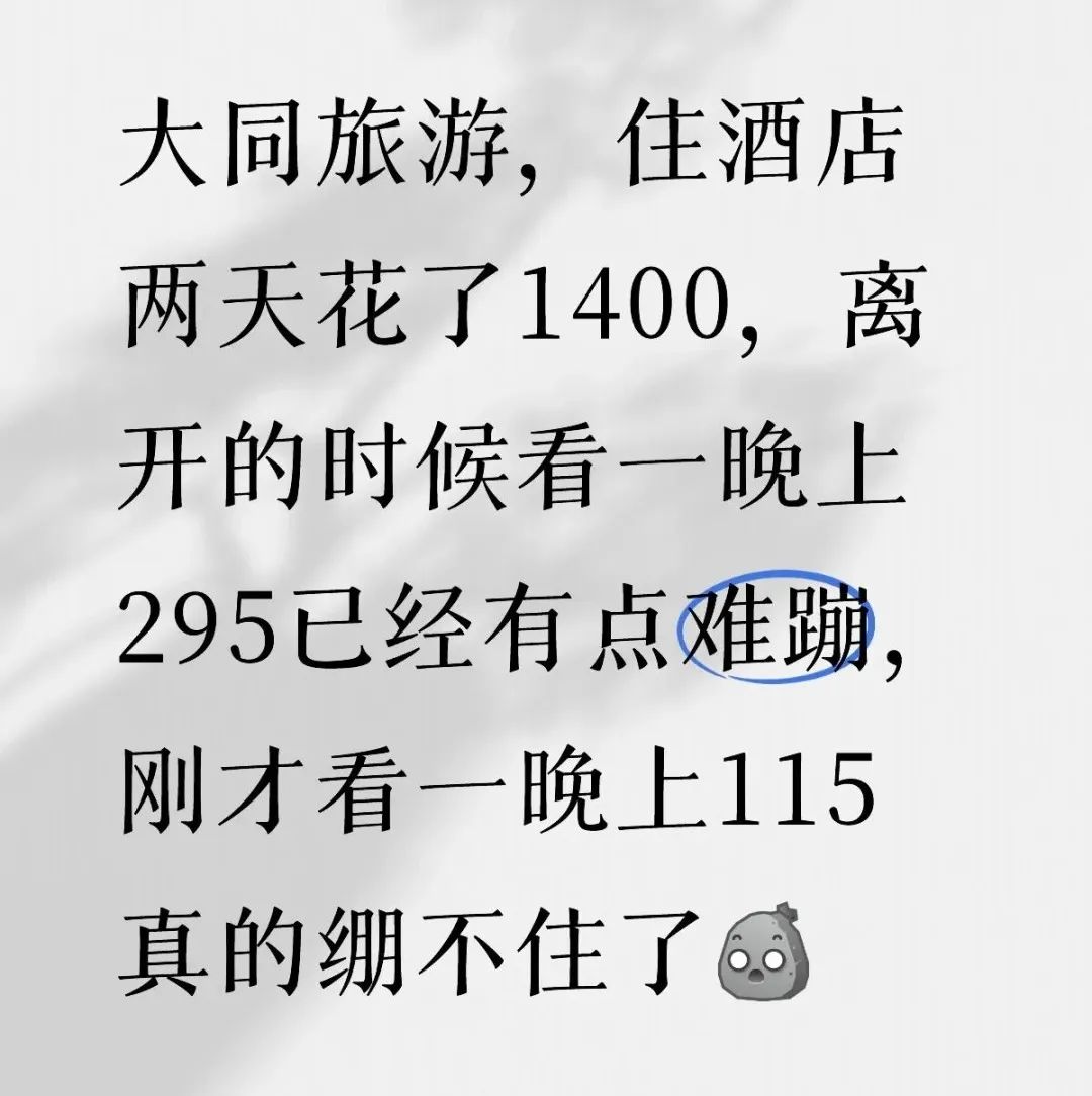 而內陸城市的酒店價格,也因為知名景點和暑期旺季水漲船高。因遊戲《黑神話悟空》爆火的山西大同,酒店價格愣是把遊客整得沒脾氣。有網友吐槽,五一去大同玩,兩天住宿費花了 1400;臨走時看某晚報價 295,已經覺得離譜,結果過了一天再查,直接跌到 115—— 這波動幅度,實在讓人繃不住。