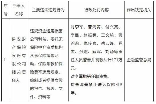 今年6月,金融監管總局披露罰單,易安財險相關責任人因違規資金運用、編制虛假報告等行為被警告並罰款共計171萬元。此前,易安財險還曾因理賠核定超期限、償付能力不達標等問題被監管部門接管,最終進入破產重整程序。