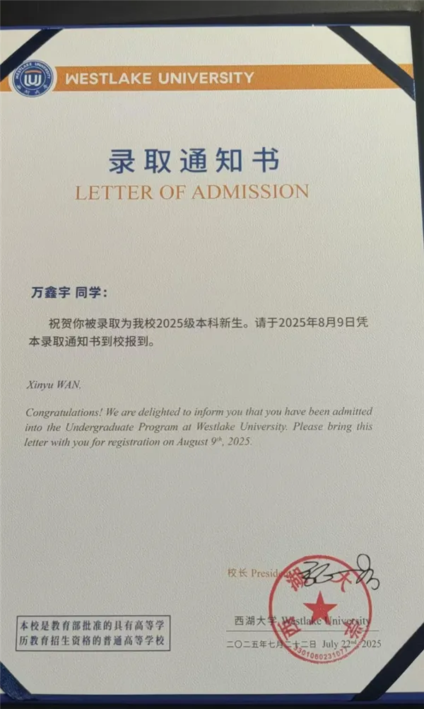 2025年,西湖大學首次走出浙江招生,其中在河南、重慶兩地通過普通高考模式招生,家長和考生尤其關注,萬鑫宇正是第一批被錄取的外地生源。