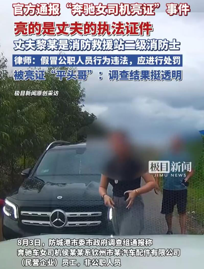 防城港奔馳車“亮證要求讓路”事件終於等來了防城港市一級的官方通報,在通報中稱“亮證姐”只是個生意人,亮的也是她老公的消防員證。而使用警務通查詢對方車主身份則是不存在的,是恰好認識是遠方親戚,和舉報者母親認識。通報稱奔馳“亮證姐”只是個生意人,這事我是相信的。畢竟如果真是“縣城婆羅門”、“城關鎮五巨頭”,也不可能開奔馳GLB這種只有個奔馳標的車,怎麼也得開個奔馳GLE起步。