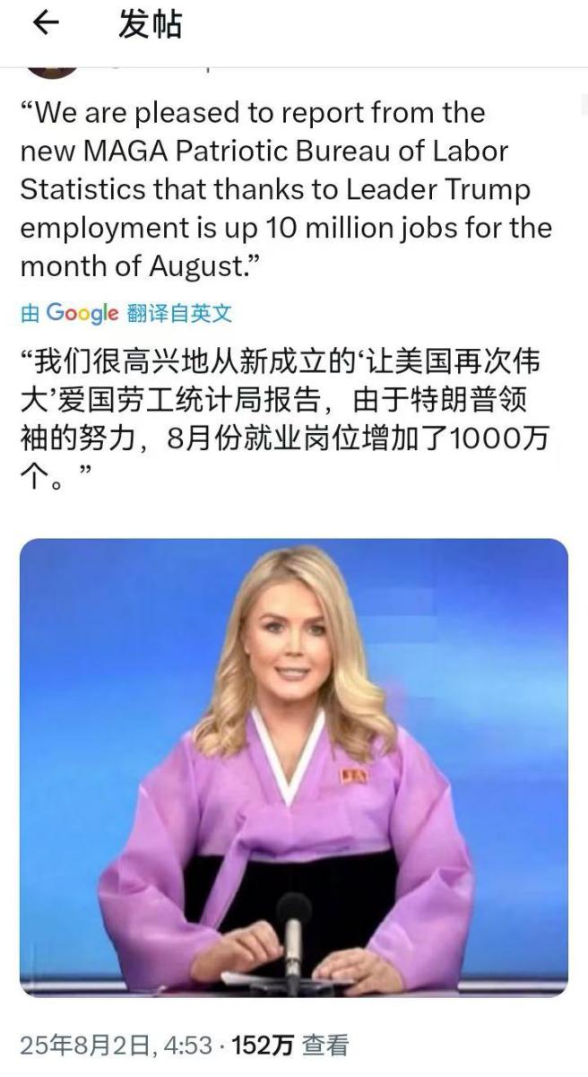 網上有個嘲笑特朗普新增就業崗位的PS帖子徹底火了。美國網友開玩笑的稱美國白宮發言人表示:“我們很高興地從新成立的‘讓美國再次偉大’愛國勞工統計局報告,由於特朗普領袖的努力,8月份就業崗位增加了1000萬個。”