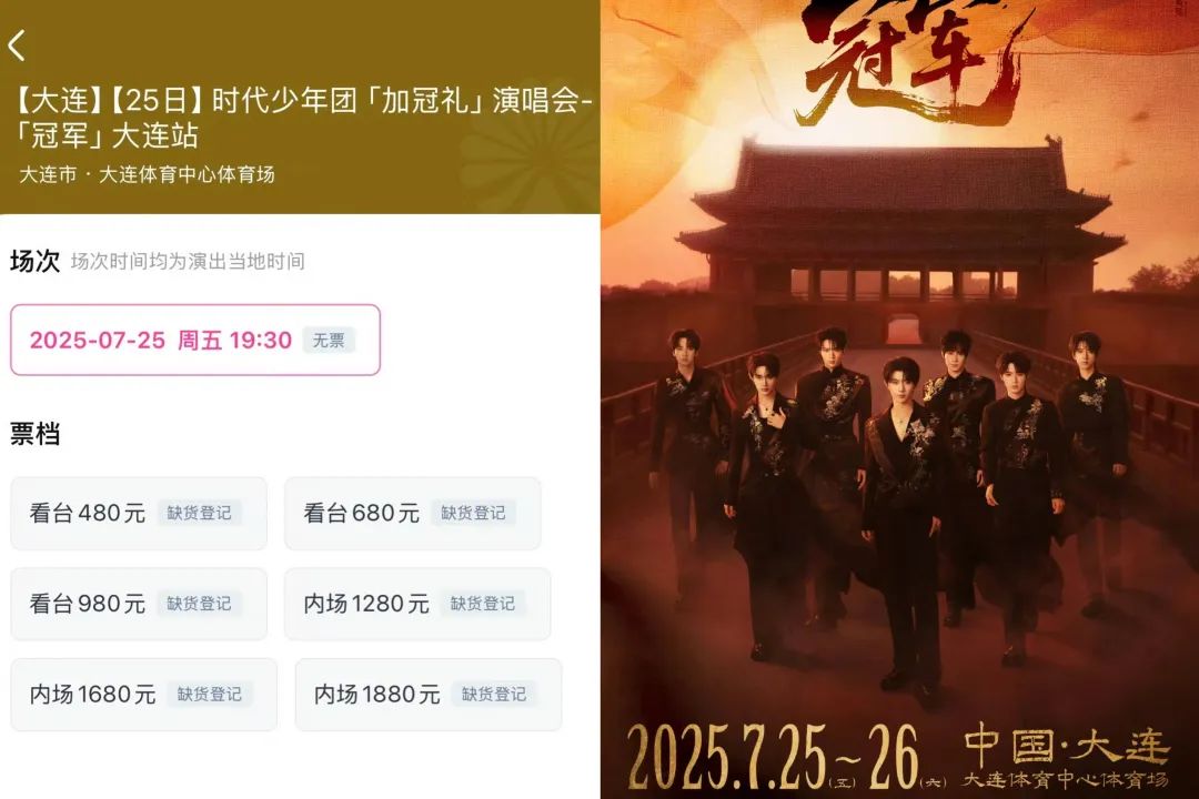 與此同時,大連體育中心上演着另一場狂熱。時代少年團“加冠禮”演唱會開票時,31270張門票引發93萬人同時搶票,大麥網服務器因流量過載陷入癱瘓。首場3萬張門票僅18秒售罄,內場第一排座位在二手平台被炒至28888元。