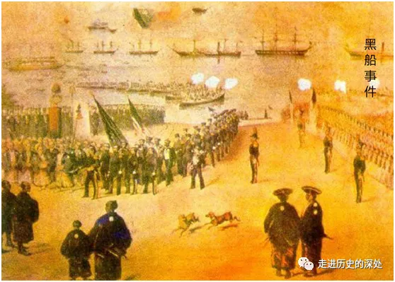 黑船事件:1853年7月,美國海軍准將佩裏率領4艘軍艦,闖入江户灣(今東京灣)內,直到橫濱附近,向日本提出通商要求。由於美國軍艦艦體漆成黑色,被日本人稱之為“黑船”。這次,美國(不是中國,也不是荷蘭)軍艦越過了“打沉線”,但幕府並沒有下令開炮。因為他們知道:在10多年前,一直被日本尊為師長、也更為強大的中國,就被英國的炮艦給打敗了。連“老師”都打不贏這些西方列強,幕府怎麼敢下令開炮?不敢打就不打,但佩裏的要求也不能不理,否則人家軍艦就不走。幕府經過一番“研究”,想出一條妙計:拖。幕府老中(幕府最高官員)派人對佩裏説:幕府將軍生病(這是事實),無法處理政務,你們明年再來吧。這裏需要説明一下:由於幕府將軍也是世襲的,不能保證後來繼位的將軍個個神武,幕府的大小事務都是老中説了算。這時的幕府將軍與天皇一樣,也成了擺設,壓根就不會處理政務。所以,幕府老中的意思,是先把佩裏給糊弄走再説,拖一天是一天。佩裏還真的信了,帶領艦隊走了,幕府老中大功告成。可到了第二年,佩裏又來了,並且帶了7艘軍艦。這次,幕府起初還是想拖,但佩裏不幹了,明確表示“不開國就開炮”。打不贏、又拖不成,只好就範了。於是,幕府接受了佩裏提出的通商要求,雙方在橫濱簽訂了《日美親善條約》。這是日本與西方列強簽訂的第一個不平等條約。這就是日本歷史上著名的“黑船事件”。這事與中國的第一次鴉片戰爭極為相似,只是中國與英國打了2年多,最後是戰敗開國。日本則吸取了教訓,沒敢與美國開戰(日本人的學習能力就是強),就直接簽約開國了。其他西方列強見到美國得手,英國、俄國、荷蘭等紛紛仿效,強迫日本簽訂了“親善條約”。也就是説,日本也是在炮艦威逼之下,結束了延續200多年的鎖國體制,被迫開放國門。令幕府意想不到的是:這國門一開,很快就導致幕藩體制徹底瓦解。