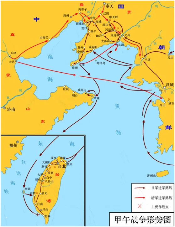 豪賭成功:1894年(清光緒20年,甲午年)2月,朝鮮爆發東學黨起義並迅速蔓延,朝鮮政府軍無力鎮壓,國王李熙急忙向宗主國清廷求援。清政府派遣葉志超和聶士成率2000清軍出兵朝鮮。準備多年的日本認為時機已到,便以保護使館和僑民為由,也派兵進駐漢城,準備發動戰爭。日軍出發前,日本外務大臣陸奧宗光訓令駐朝公使大鳥圭介,“得施行認為適當之臨機處分”。實質是授權大鳥圭介挑起事端,尋找發動戰爭的藉口。後東學黨起義軍與朝鮮政府達成和議,局勢恢復平靜。危機解除後,朝鮮政府要求中日兩國撤兵。但日本不僅不撤兵,反而向朝鮮增兵,致使中國、朝鮮與日本的撤兵談判破裂。6月22日和7月14日,日本兩次向朝鮮政府發出“絕交書”。7月23日凌晨,日軍突襲漢城王宮,擊潰朝鮮守軍,挾持朝鮮國王,解散親華政府,扶植朝鮮國王的父親李昰應上台攝政,一舉控制了朝鮮政府。之後,日本唆使朝鮮親日政府斷絕與清廷的關係,並“委託”日軍驅逐駐朝清軍。面對日本的種種挑釁和增兵舉動,清廷也開始向朝鮮增兵。7月25日,日本不宣而戰,在黃海豐島海面偷襲增援朝鮮的清廷軍艦,擊沉清軍租來運兵的英國商輪“高升”號,挑起了甲午戰爭。補充説明一下:日軍慣於偷襲,不僅甲午戰爭,後來的日俄戰爭和太平洋戰爭等,三次賭國運戰爭,都是從偷襲開始。8月1日,中日兩國正式宣戰。在陸上,清軍在平壤戰役中失敗,狂奔五百里,一路逃過鴨綠江回到國內;在海上,北洋水師在黃海海戰中慘敗。戰火隨即燒至遼東半島和山東半島。11月22日,日軍攻陷旅順口,製造旅順大屠殺,4天之內屠殺了2萬多中國居民。這是日本近代在中國實施的第一次大規模屠殺平民事件,後面還有很多次。之後,日軍一路北上,至1895年3月佔領整個遼東半島,前鋒抵達營口一線。1895年1月23日,日軍在山東半島的榮成登陸,2月3日佔領威海衞,2月17日攻佔劉公島,整個威海衞海軍基地全部陷落,北洋水師全軍覆沒。日本在甲午戰爭中大獲全勝,第一次“賭國運”大獲成功。甲午慘敗,標誌着大清30多年洋務運動的徹底失敗,從此加速沉淪;而日本卻信心倍增,其擴張野心加速膨脹,一發不可收拾。