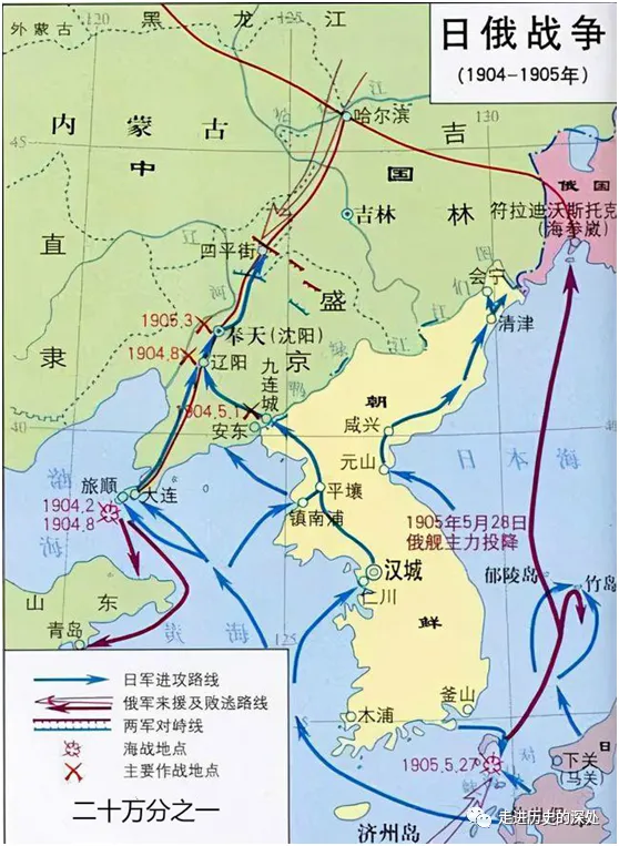飲恨遼東:由歐洲東侵至太平洋沿岸的沙俄,有一個既定的遠東政策,早已視中國東北為其囊中之物,在奪佔外東北(黑龍江以北和烏蘇里江以東地區)和庫頁島等地之後,開始興建西伯利亞鐵路。其垂涎東北已久,並把朝鮮納入勢力範圍。因此,日本甲午發動甲午戰爭,割佔遼東半島及吞併朝鮮的意圖,直接衝撞了沙俄的遠東政策。1895年4月17日,即《馬關條約》簽訂當天,俄國向日本發難,其外交大臣羅拔諾夫會見德國和法國駐俄公使,表示“俄國政府決定,立即以友誼方式,直接向日本政府提出不要永久佔領中國本土的請求。我們的計劃是,如果日本不接受此項友誼的忠告,俄國正考慮三國對日本在海上採取共同軍事行動,切斷日軍在中國大陸與本土間的一切交通”。德、法兩國基於自身利益,積極響應俄國,三國結成聯盟,共同對日交涉。1895年4月23日,三國駐日公使向日本外務省送達一份備忘錄,內稱“今日本國割佔遼東,既有危害中國之首都之虞,也讓朝鮮國之獨立有名無實,有礙維持遠東之和平。故今勸諭貴國確認放棄佔領遼東半島”,並限日本在15日之內答覆。更讓日本難堪的是,俄、德兩國公使還在現場發表講話:俄國公使希特羅渥説“日本永久佔領遼東半島,恐怕會招致衝突”。德國公使哥特斯米德更直白,説“日本必須讓步,因為對三國開仗是沒有希望的”。兩國直接向日本發出了戰爭威脅。日本內閣對三國備忘錄經過反覆研究後,確定了一個基本方針:對三國可以讓步,對中國寸步不讓。1895年5月4日,日本內閣會議決定並向三國提交以下內容覆文:“日本帝國政府根據俄、德、法三國政府之友誼的忠告,決定放棄遼東半島之永久佔領”,但要求清廷支付1億兩贖金。後經三國及清廷交涉,贖金減到3000萬兩。日本作為新崛起的帝國,本在三國的公開威脅之下,被迫放棄已經到手的遼東半島。此事被 日本視之為奇恥大辱,一直懷恨在心。隨後利用清廷賠款(為日本年財政收入的4.35倍),其中85%用於發展軍備,期待報仇雪恨。需要説明的是,沙俄等三國出面干涉還遼,完全是出於自已利益,決非出於道義。後來沙俄在東北的所做所為,完全證明了這一點。