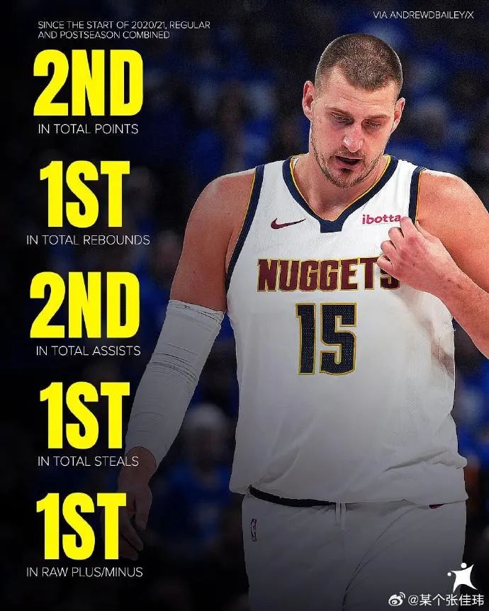 約基奇得分聯盟第二(塔圖姆第一),籃板聯盟第一,助攻聯盟第二(楊第一),搶斷聯盟第一,RPM聯盟第一。