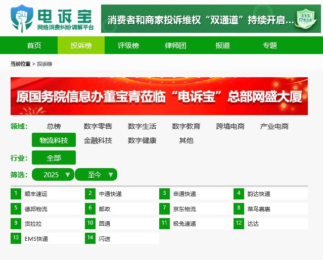 據網絡消費糾紛調解平台網經社“電訴寶”2025年至今受理的中國物流科技領域用户有效投訴顯示,入選投訴榜的依次為:順豐速運、中通快遞、申通快遞、韻達快遞、德邦快遞、郵政、京東物流、菜鳥裹裹、貨拉拉、極兔速遞、圓通、極兔速遞、達達、EMS快遞、閃送。