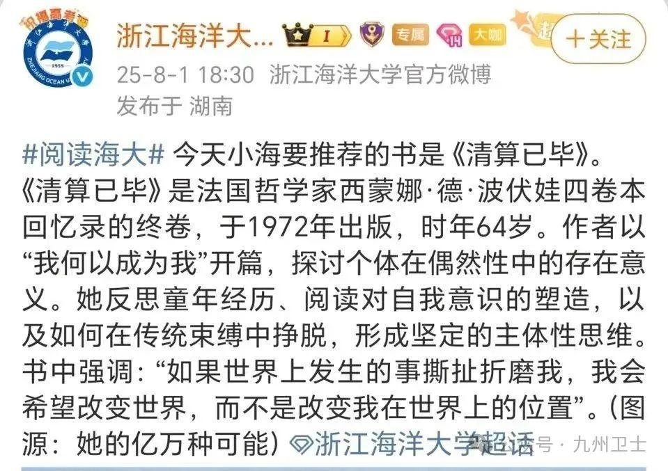 在8月1日這個特殊的日子,華中科技大學、浙江海洋大學、哈爾濱工程大學和復旦大學等多所高校的官方微博賬號,不約而同地推薦了女權主義代表人物波伏娃及其著作。